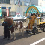 温泉の近くの農家さんが不定期ですが幌馬車を走らせてくれてます。 出会えた方は「ラッキーっ!」と思ってぜひ乗ってみてください。 注)ちなにみうしろのパトカーはたまたま別の用事でいただけですのでお気になさらずに・・・