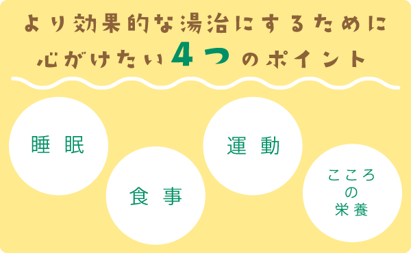 以下のポイントを意識して湯治療養することが、きっと皮膚症状の改善への近道となるでしょう。